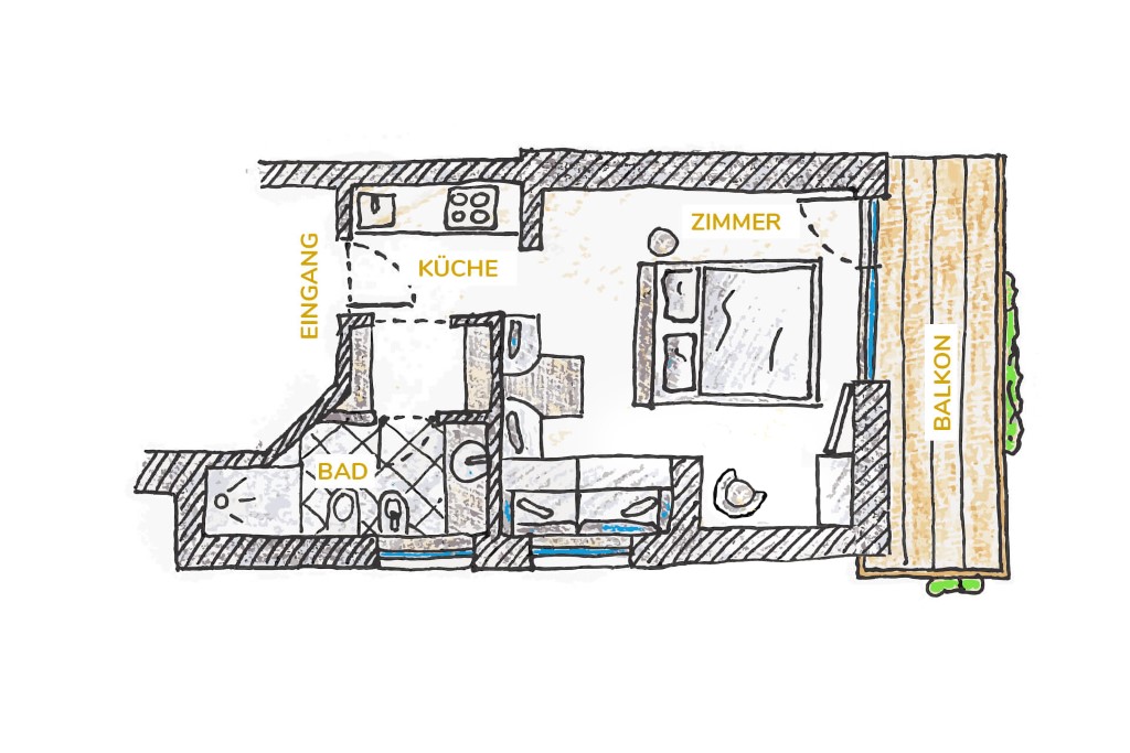 - Wohnküche mit kleiner Kochecke, Glaskeramik-Kochplatte, Backofen, Kühlschrank mit Gefrierfach, Kaffeekocher