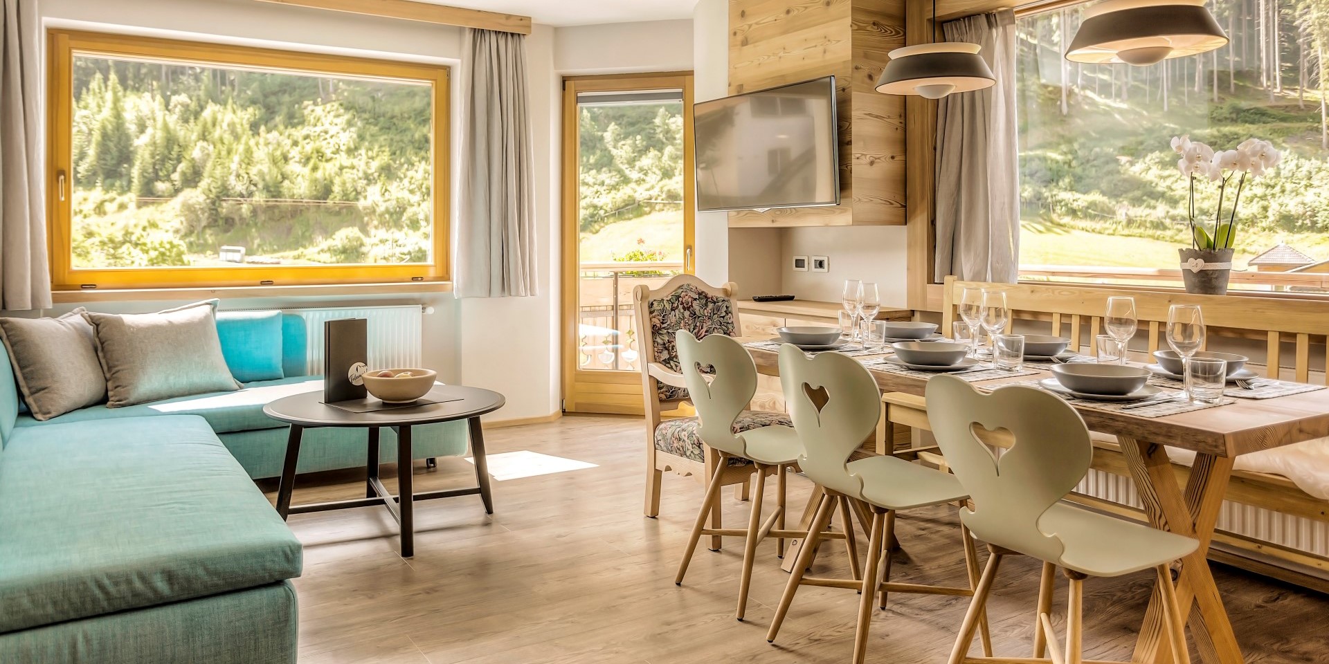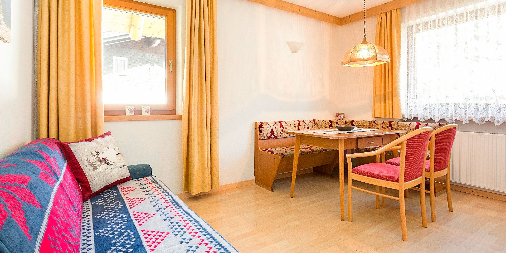 - Stube, typischer tirolerischer Wohnraum mit Sat-TV, Nusstisch und tirolerischer Eckbank