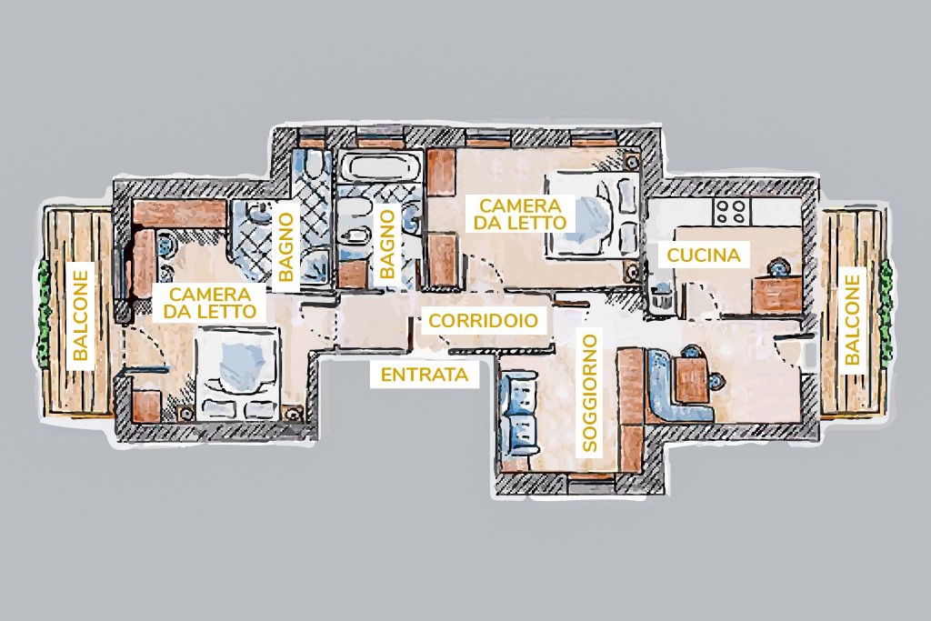 - 2 bagni con servizi igienici, lavandino, doccia, bidet, asciugacapelli e finestra